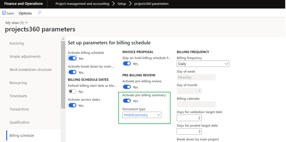 On projects360 parameter form, under billing schedule tab, a new parameter “Activate pre-billing summary” has been introduced to control the pre-billing summary functionality. When this checkbox is turned on ‘Yes’, the Pre-billing summary feature is activated.