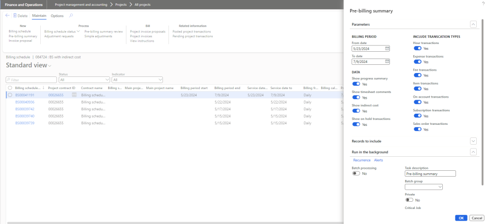 New button is introduced to generate pre-billing summary where a report will be created showing a summary of % progress and transactions for all the projects in the structure from “Billing schedule” form. This report will be available for the review where users will be able to highlight, makes notes, corrections or any edits.