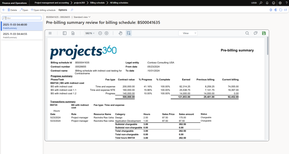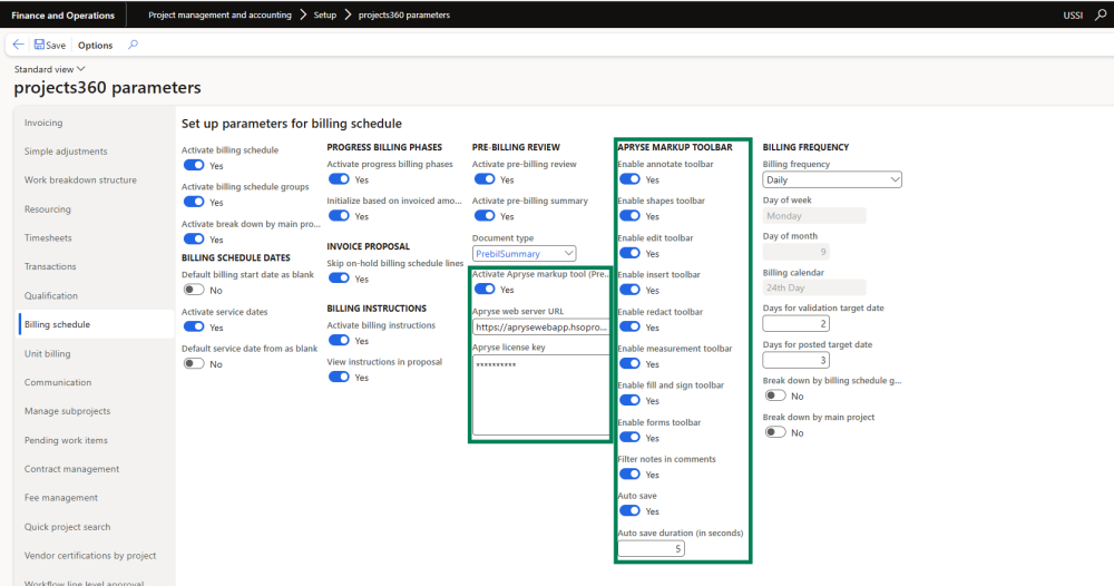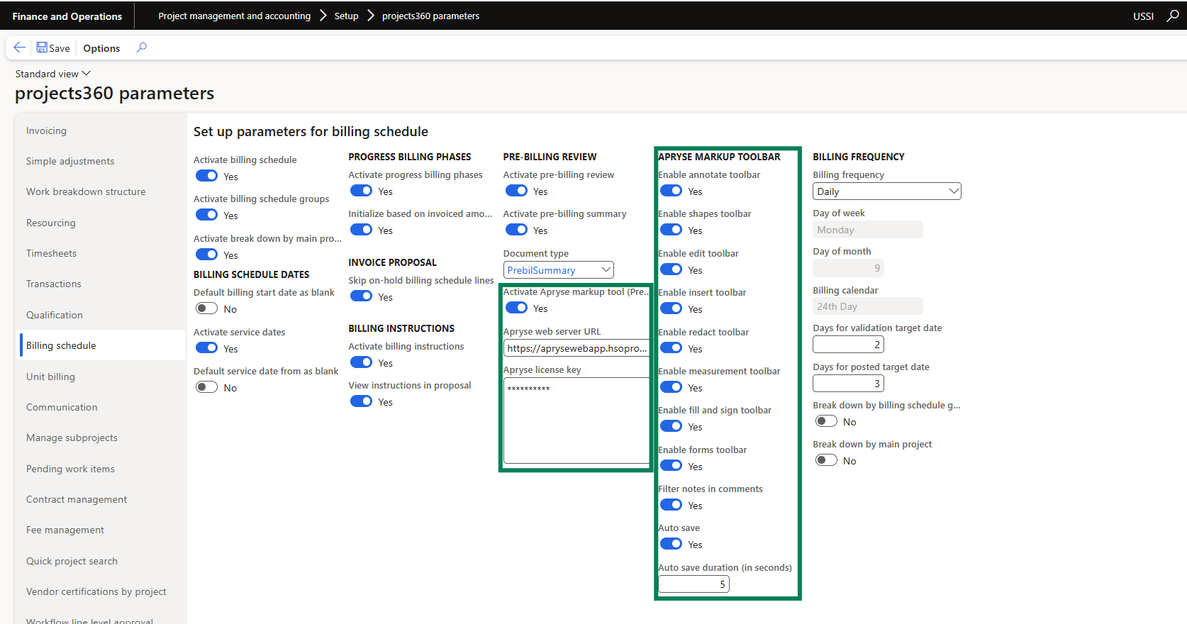 On projects360 parameter form, under Billing schedule tab, a new parameter “Activate Apryse markup tool” has been introduced to manage Pre-billing summary review in PDF format. These capabilities enable users to make the required changes directly on the PDF invoice, ensuring accuracy and reducing the need for manual adjustments. User needs to set the ‘Activate Apryse markup tool’ field value to ‘Yes’ in order to use this feature and define the related fields.