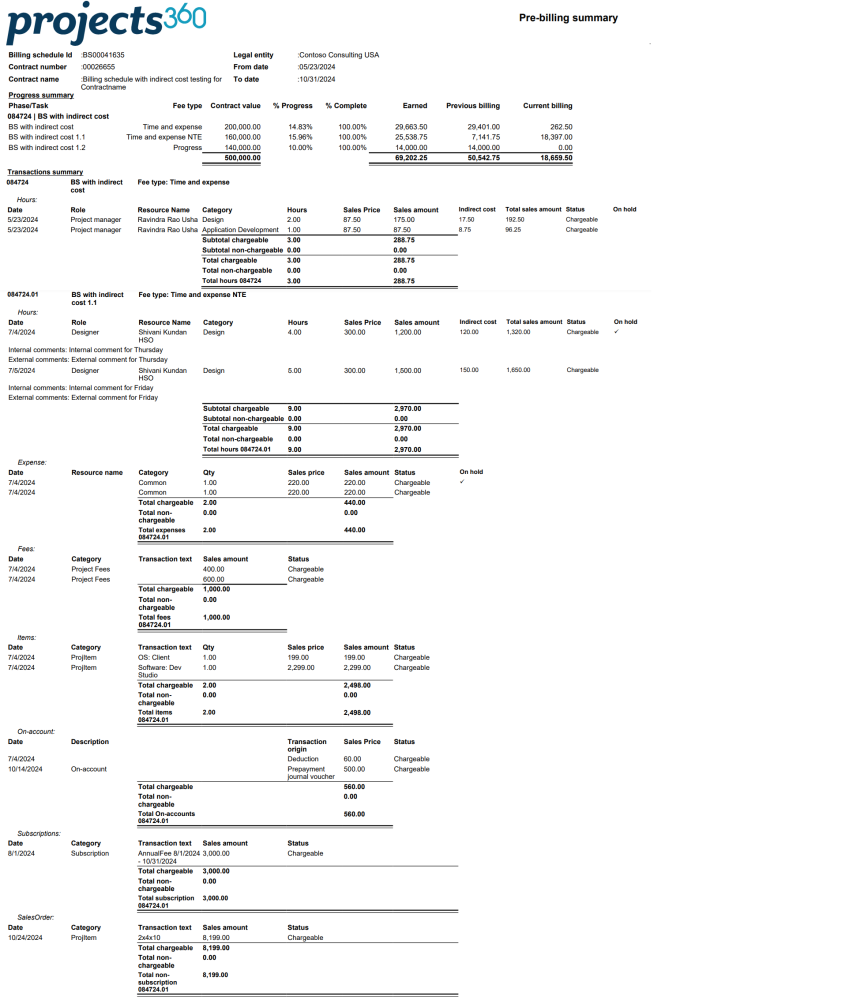 | Note – When the Show timesheet comments parameter is marked while generating the report, Internal comments and External comments will get displayed for the timesheet transactions. Internal and external comments on pre-billing summary review report will appear for new transaction generated after adjusting the hour transaction based on corresponding timesheet comment. |