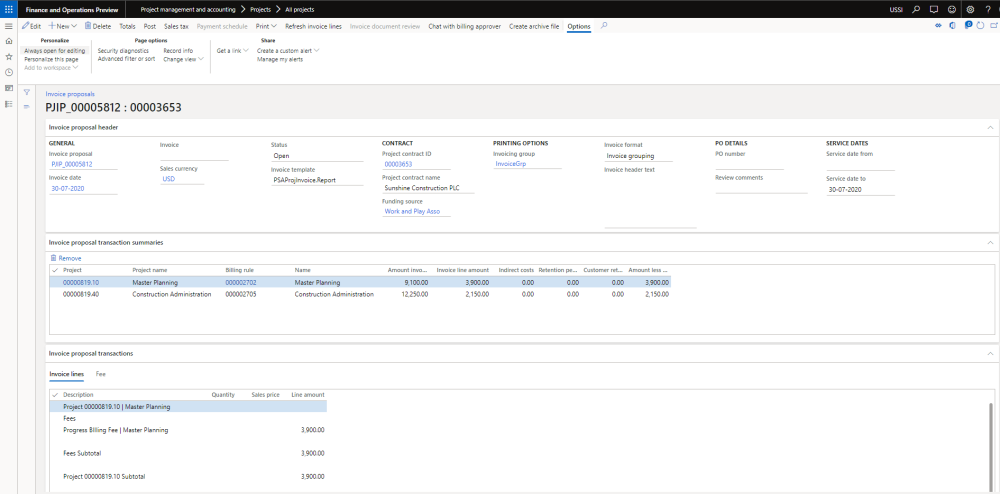In this project type the billing will be based on the progress of the project. Create a project with the project group of fee type “Progress” and when the user opens the new fee management form, the line with fee type “Progress” will get automatically created and a billing rule will be automatically created on project contract with the Fee budget amount as zero. Once the user updates “Fee budget” then a corresponding fee forecast line will be automatically created on fee forecast form and billing rule will be updated with the contract value amount.