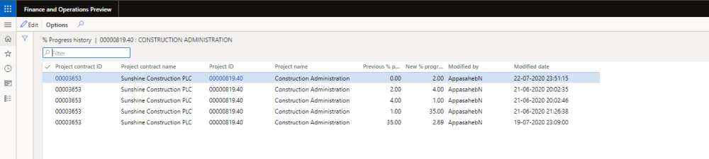 | Progress% | This field will be editable for projects with fee type as ‘Progress’. This field is used to update the percentage complete value for project and based on this value the invoice proposals can be created. |