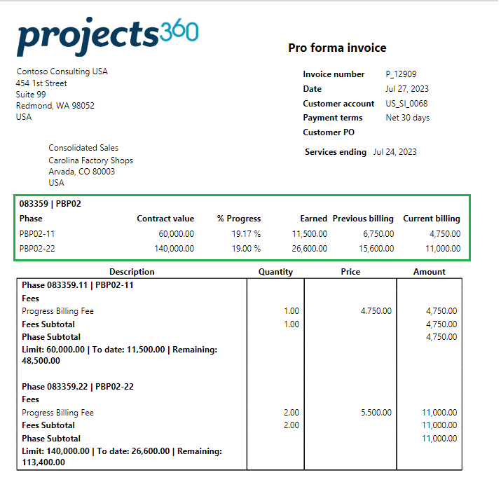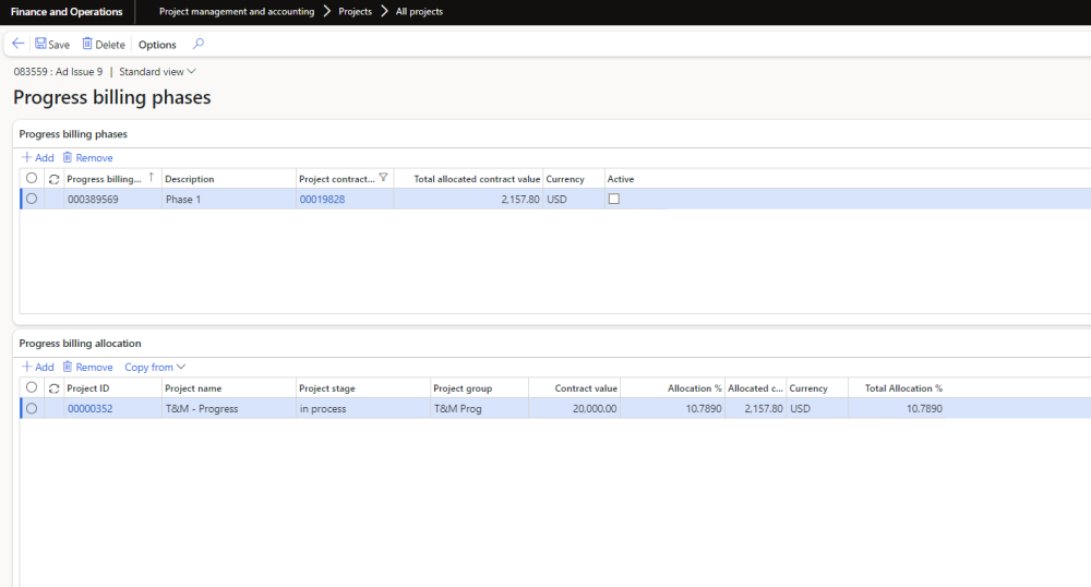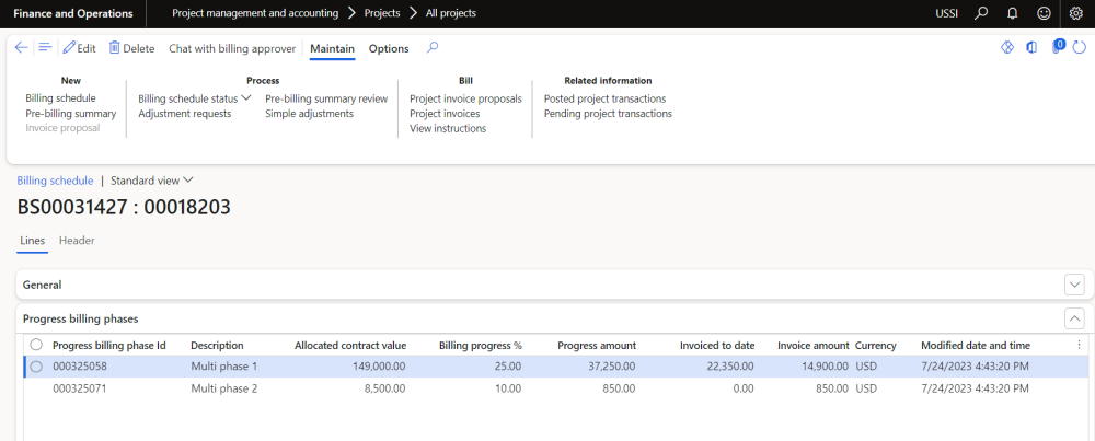 Progress billing phases functionality in Billing schedule enables users to perform progress billing based on a new configurable structure for invoicing purposes. Users can define different phases and % of the contract value to be billed in each phase at the project contract level.
