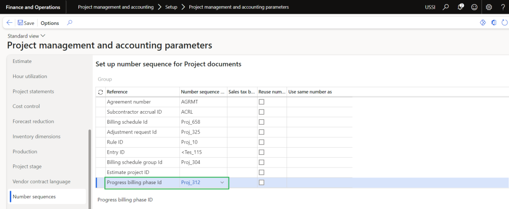 | Progress billing phase ID | Define this field to generate automatic number sequence for progress billing phases. |