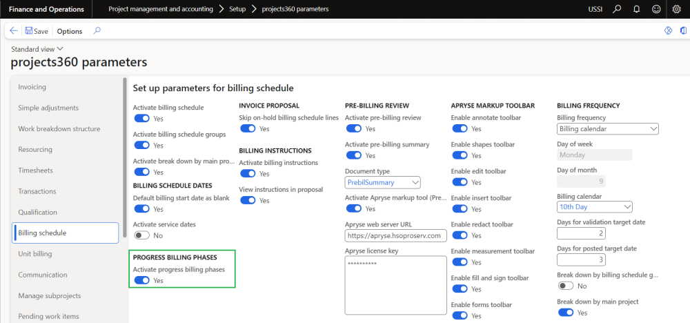 On projects360 parameter form, under billing schedule tab, a new parameter “Activate progress billing phases” has been introduced to control the progress billing phases functionality. When this checkbox can be turned on to ‘Yes’ only when “Activate billing schedule” checkbox is turned on.