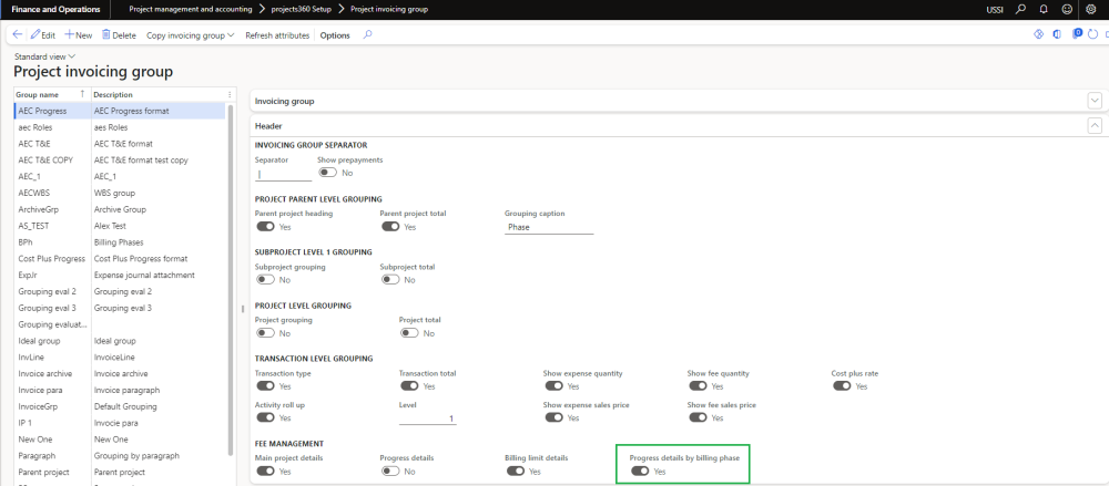 | Progress details by billing phase | When this parameter is marked, progress details will be displayed based on the billing phase. |