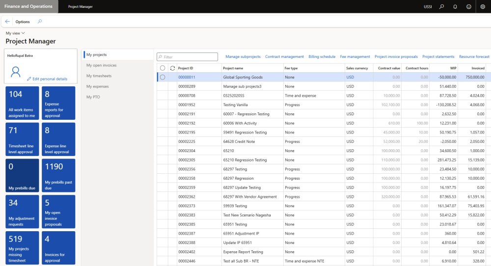 The PM can approve the timesheet lines, expense report, invoice proposal etc. which are assigned to him. Also, PM can directly create new timesheet, new expense report, new PTO request. Users having the role of Service industry super user, Service industry view role, Project accountant, Project manager, AEC principle, AEC project accountant, AEC project manager can access this workspace.