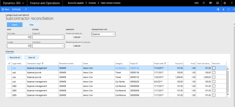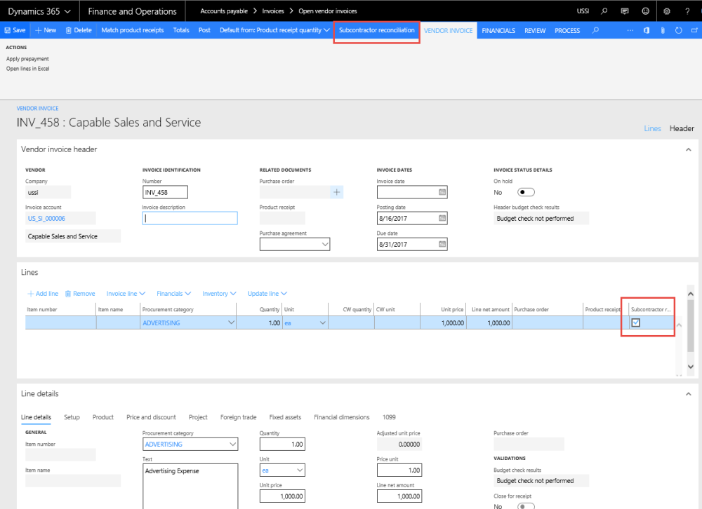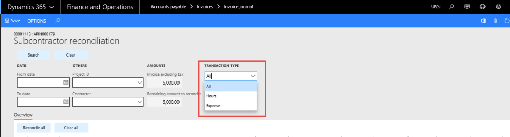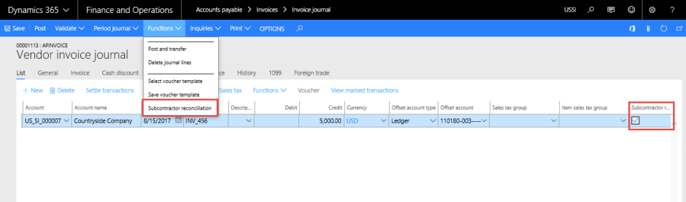 Subcontractor reconciliation functionality has been extended to Open vendor invoices. The functionality is similar to what is available in the Invoice journal form. The subcontractor reconciliation button is enabled on the action pane when the vendor selected in the invoice belongs to the Vendor group that is selected as sub-contractor.