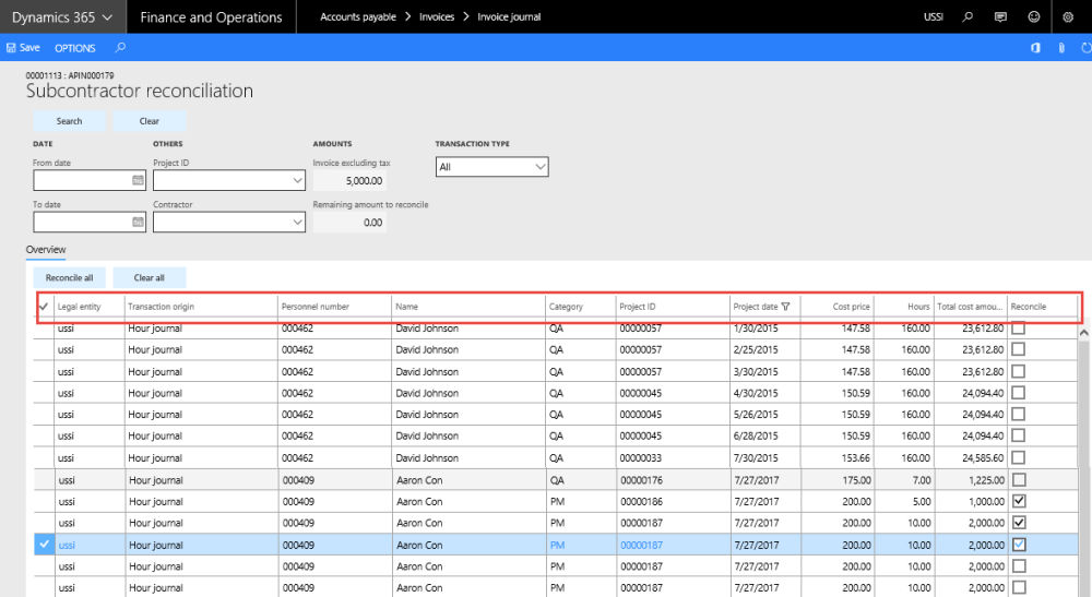 | The Amount remaining to reconcile field has 5000 amount. All timesheet entries are available in the Overview pane and only marked lines are available for reconcile | |