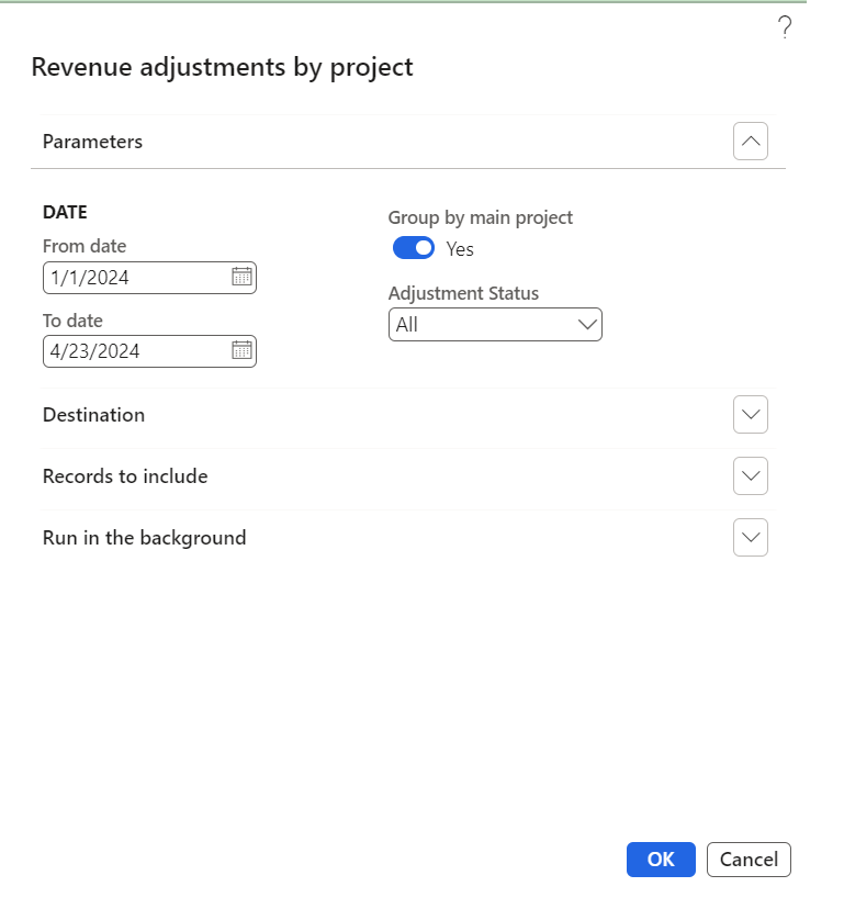 | Group by main project | Set this parameter to Yes if the revenue adjustment transactions to be grouped and displayed based on main project. |