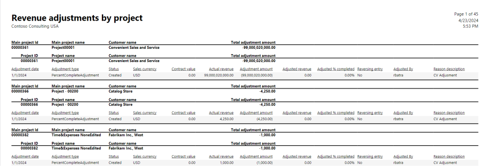 This report provide the details of the revenue adjustments details for the project displaying the details of each adjustment.