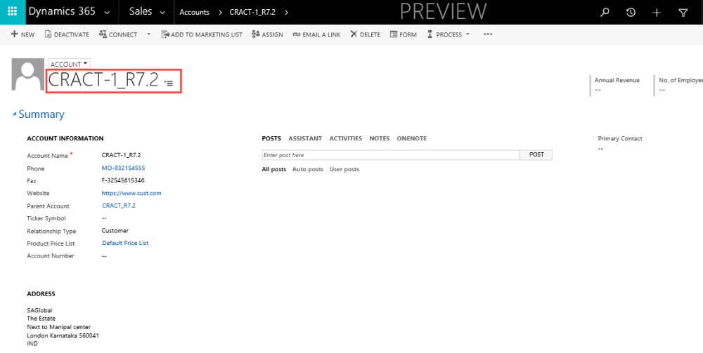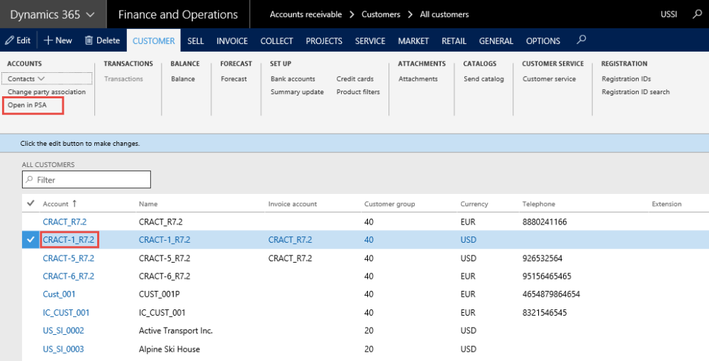 The Customer data integrated from Project Service Automation application (PSA) to Microsoft Dynamics 365 for Finance and Operations can be review on Customer master form.