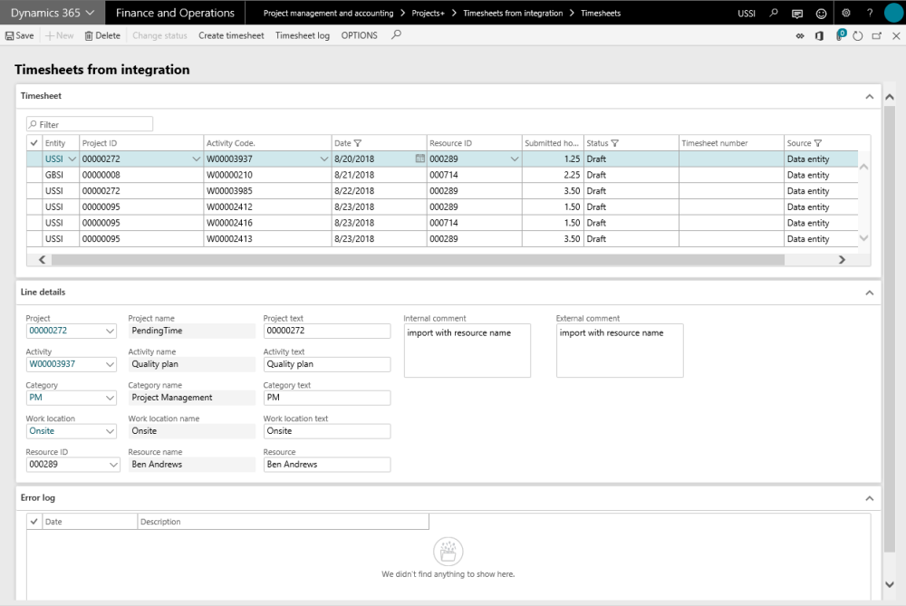 Shows all the imported records in this grid. Most of the fields on this grid are editable, except the timesheet number and source. Timesheet number field is updated on successful transfer of line to the timesheet. Source field updated to ‘Data entity’ for all records on this form coming from either excel import or through the PSA integrations. Data on this grid filtered with status as not ‘Processed’ and source as ‘Data entity’ by default.