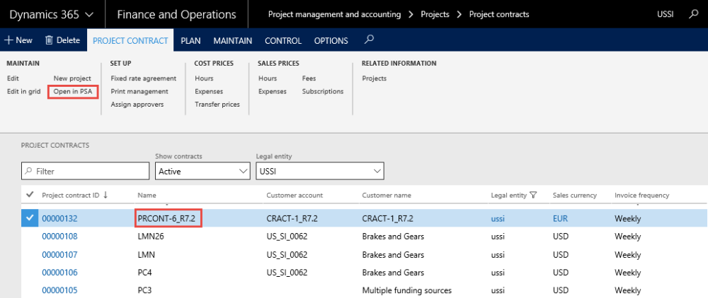 The project contracts data integrated to Microsoft Dynamics 365 for Finance and Operations can be compared with Project Service Automation application (PSA) on the below form.