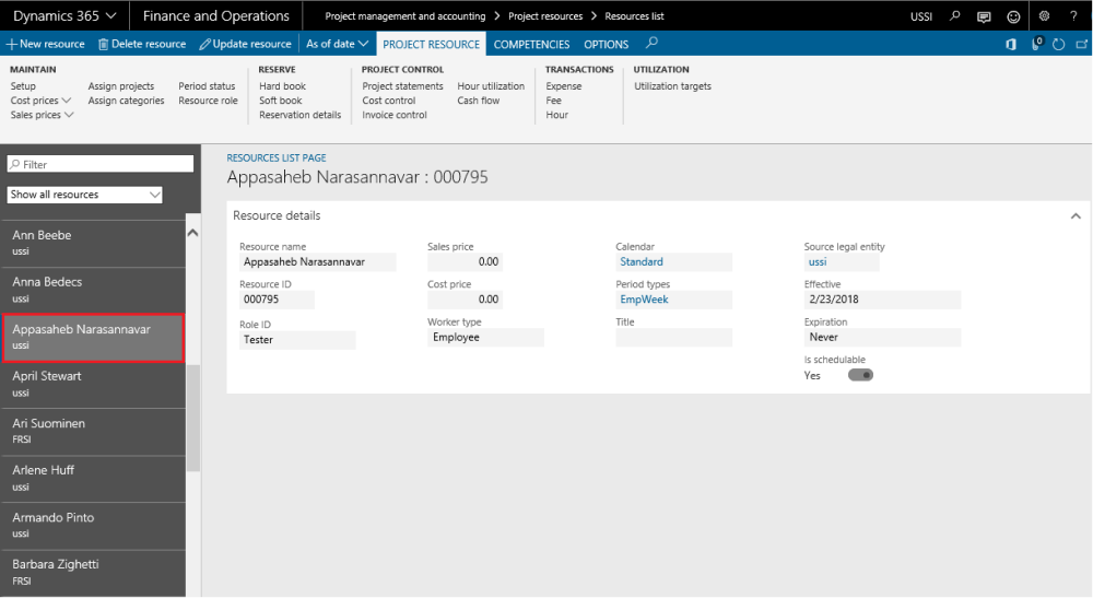 The resource data integrated from Project Service Automation application (PSA) to Microsoft Dynamics 365 for Finance and Operations can be reviewed on resource list page.