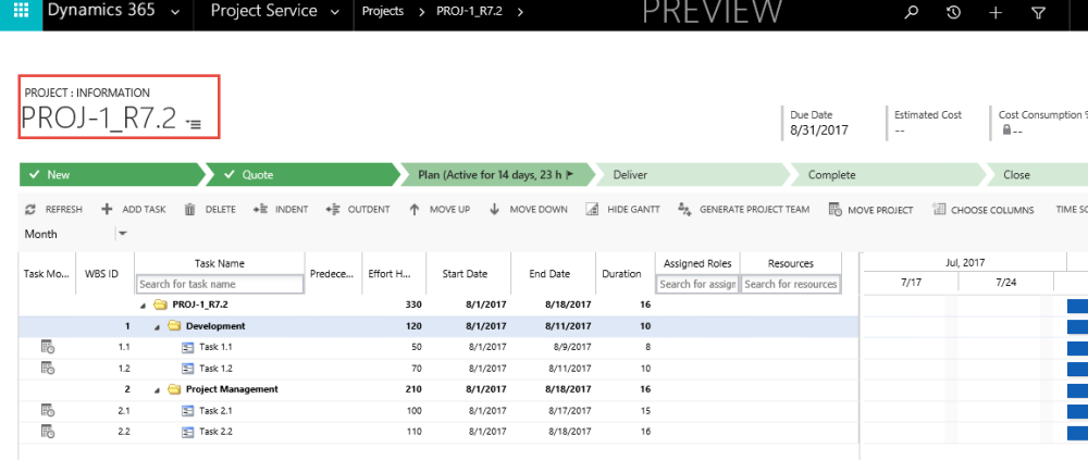 The work breakdown structure data integrated to Microsoft Dynamics 365 for Finance and Operations can be compared with Project Service Automation application (PSA) on the below form.