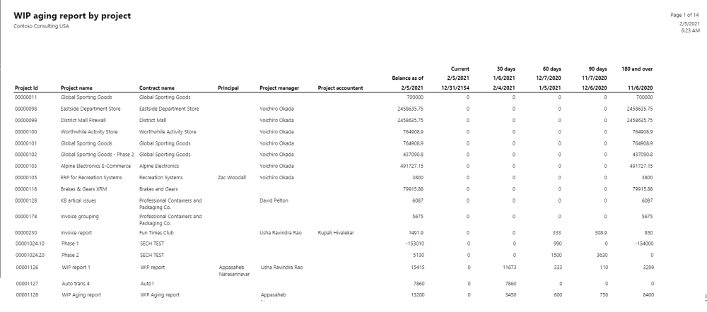 This new report displays project revenue WIP amounts by aging periods. WIP balances will be grouped by project and can rollup the values per main project based on the parameter while generating the report. Users can view the data based on project, project contract and responsible person.