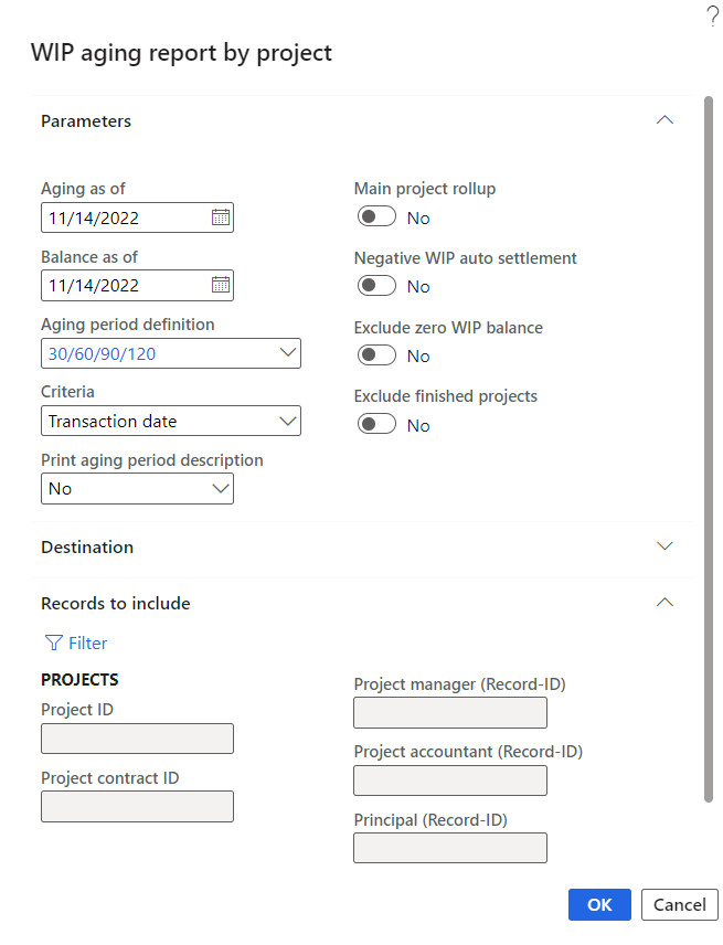 This feature is not controlled by a parameter. However, the aging periods has to be defined by which the WIP aging will be executed. Using this setup, a periodic report is generated that categorizes a company’s WIP revenue that has been outstanding.