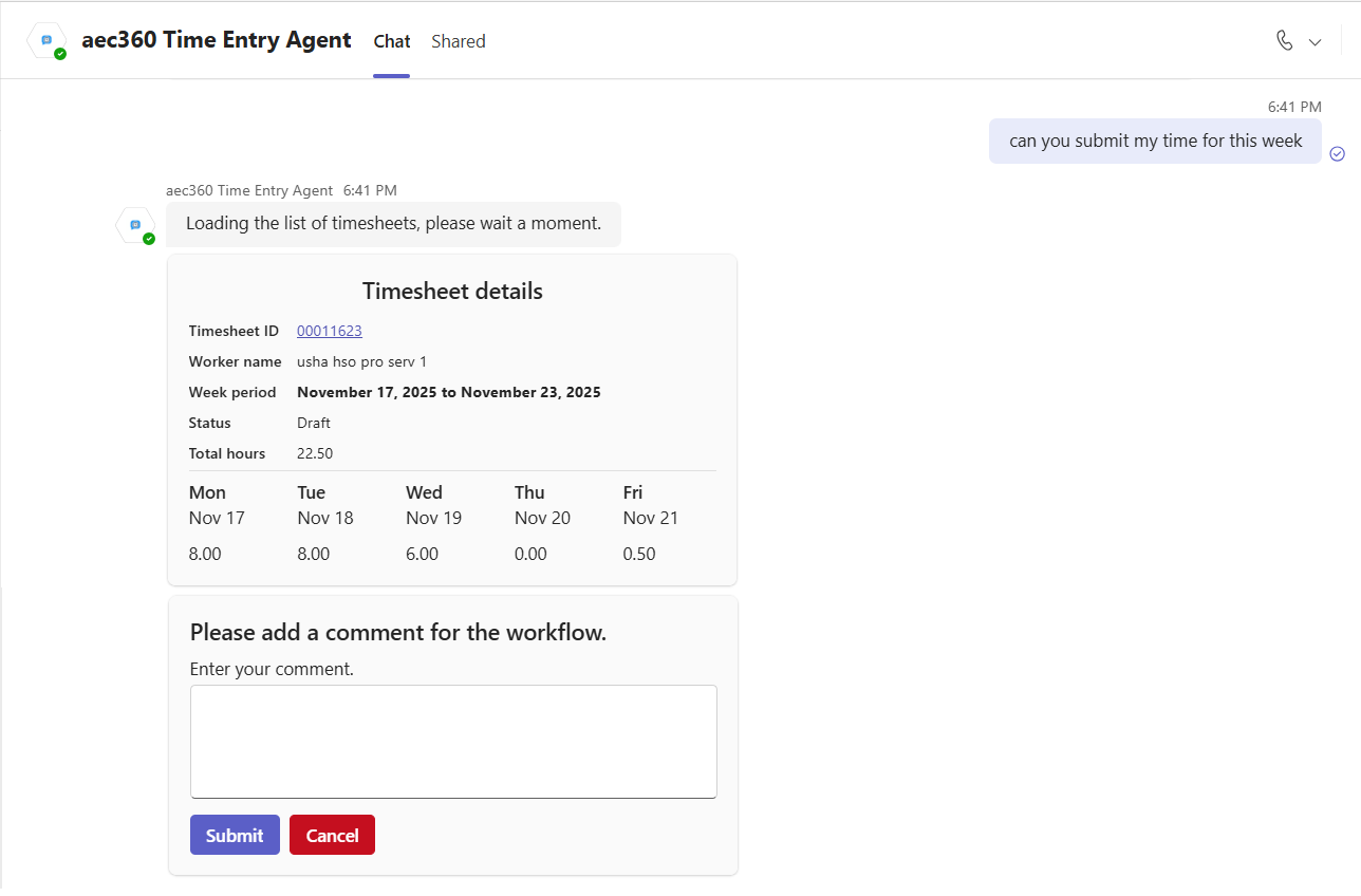 Users can simply ask the agent to submit the timesheet for the current week. The agent automatically locates the timesheet for that week and displays key details such as the timesheet ID, week period, and logged hours. Before submission, users can review these details, add or update submission comments, and then proceed to finalize the timesheet