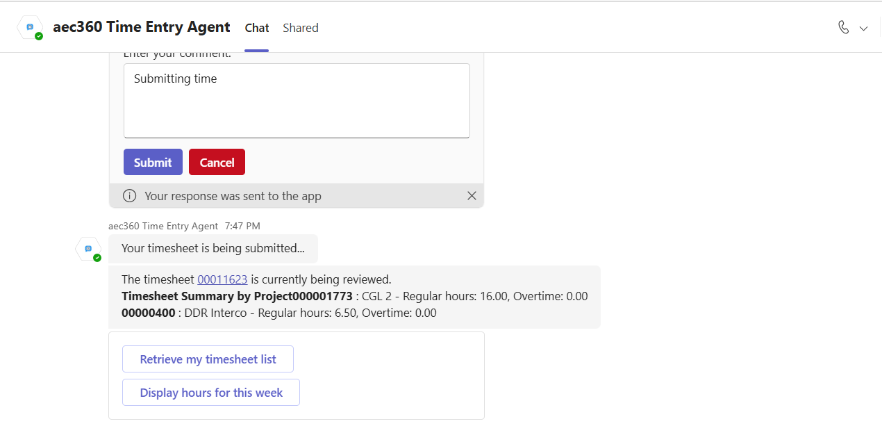 After submission, the agent confirms that your timesheet is under review and provides a summary grouped by project, showing the hours logged for each. This gives you a clear view of how your time was allocated across projects while the approval process is in progress.