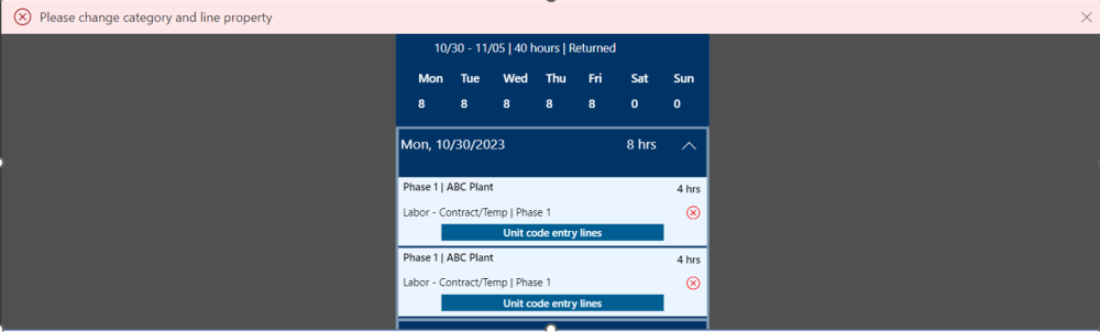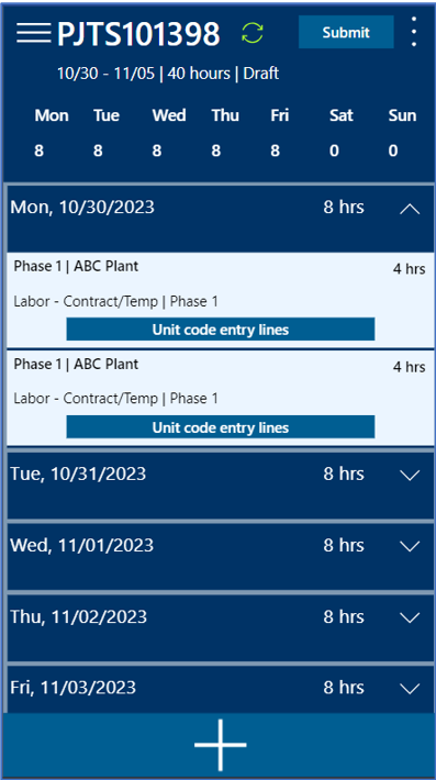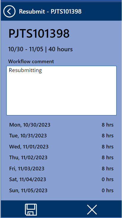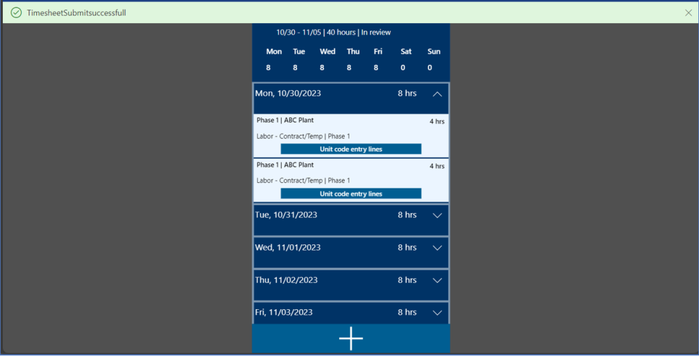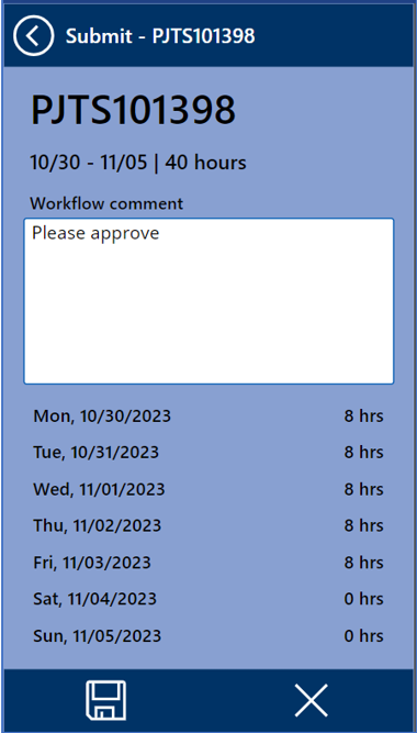 Upon entering and saving the timesheet entry, the application facilitates a smooth submission process. Prior to finalizing the submission, users are provided with a comprehensive overview of the saved timesheet information. Plese note that the submission is only available if the mobile device is online and can connect with the F&O environment.