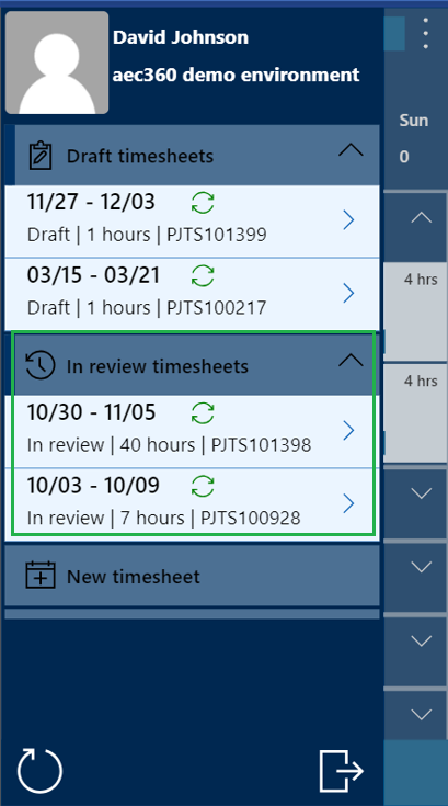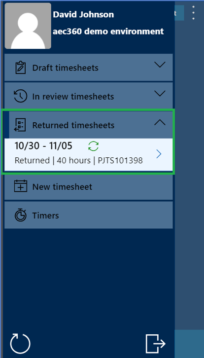 When timesheets are returned by the approver, such timesheets will appear under ‘Returned timesheet’ menu section. As soon as a timesheet is returned in F&O it can be refreshed right away within the app.