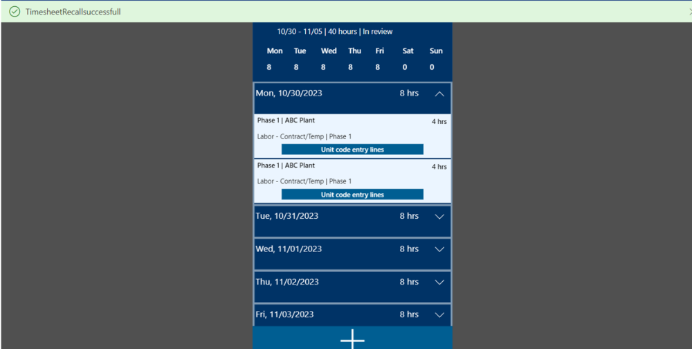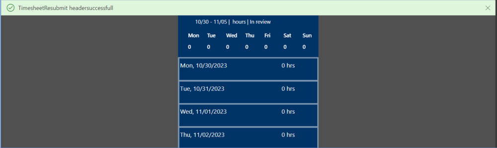 When the timesheet is in ‘In Review’ status, the ‘Submit’ button transforms into a ‘Recall’ button. Clicking the ‘Recall’ button triggers the recall process, facilitating the retrieval of the previously submitted workflow in F&O,