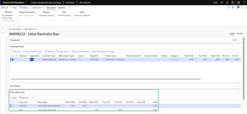 A new section ‘Unit codes entry’ is added on the timesheet which allows users to quickly enter unit codes. Based on the unit codes entered on the timesheet, automatically expense journal and/or a fee journal will get posted when user posts the timesheet. When the timesheet is created for intercompany, then the unit code journals will get posted in the legal entity for which the timesheet get posted.
