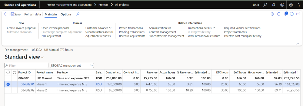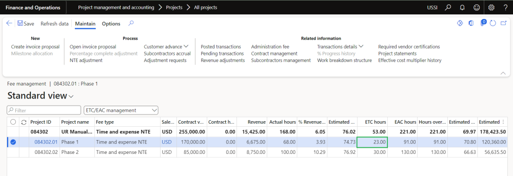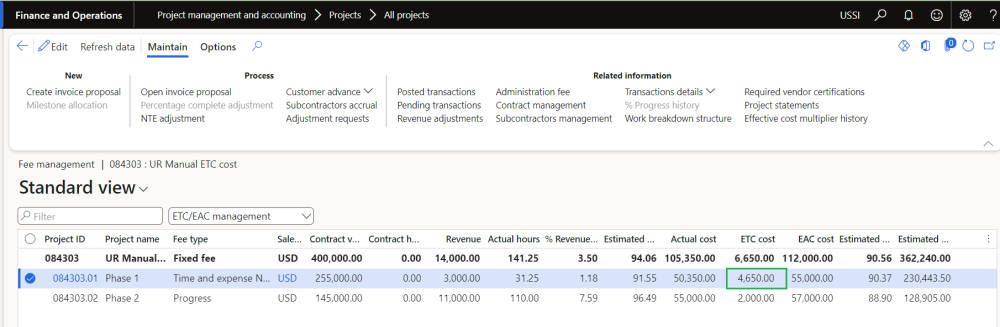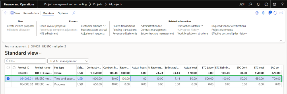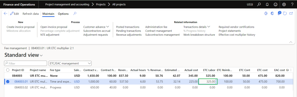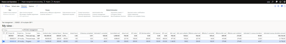 New view option “ETC/EAC management” is added on the existing Fee management form. This view option will be available when “Activate ETC/EAC management” parameter is set as “Yes”. New fields will be initialized only when the “ETC/EAC management” view option is selected on the Fee management form. New menu item is created to open and initialize the “Fee management” form directly as “ETC/EAC management” on the projects form.