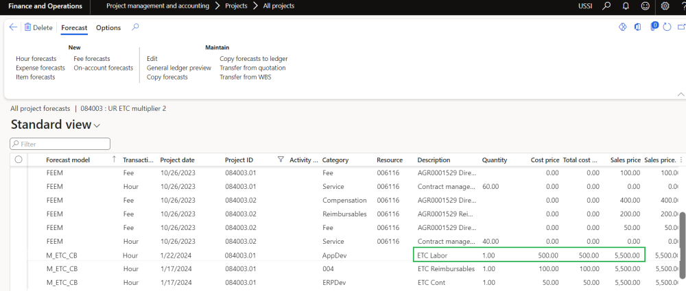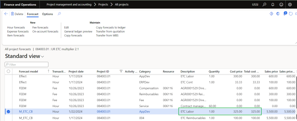 | ETC cost | Shows sum of cost from all hours forecast transactions related with Project Id and Forecast model set on the project contract/parameter. This field is visible only when ETC/EAC calculation method” is set as “Cost”. |