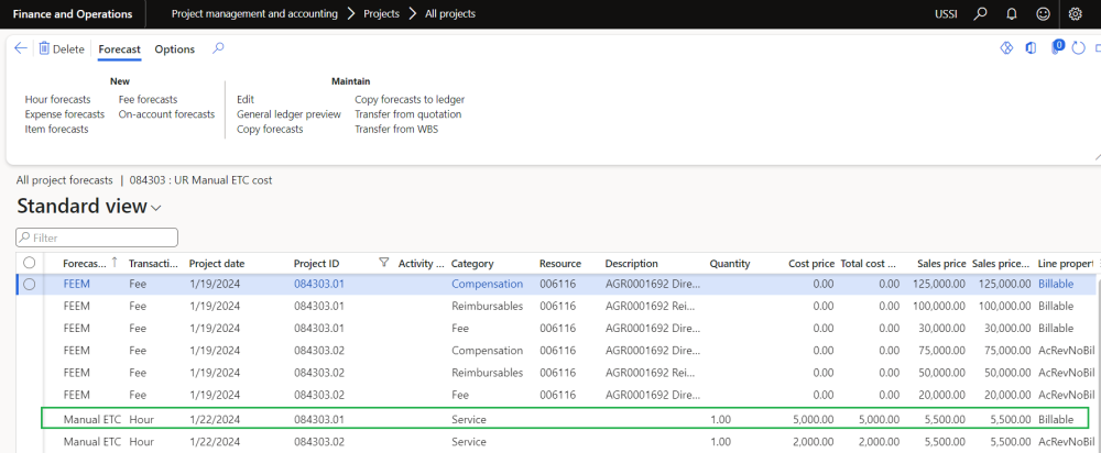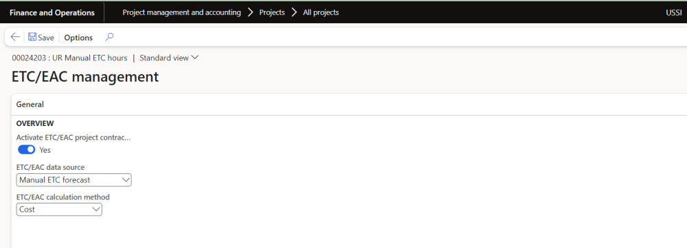 On Contract management – ETC/EAC settings id defined as Manual ETC forecast” with calculation method as “Cost”