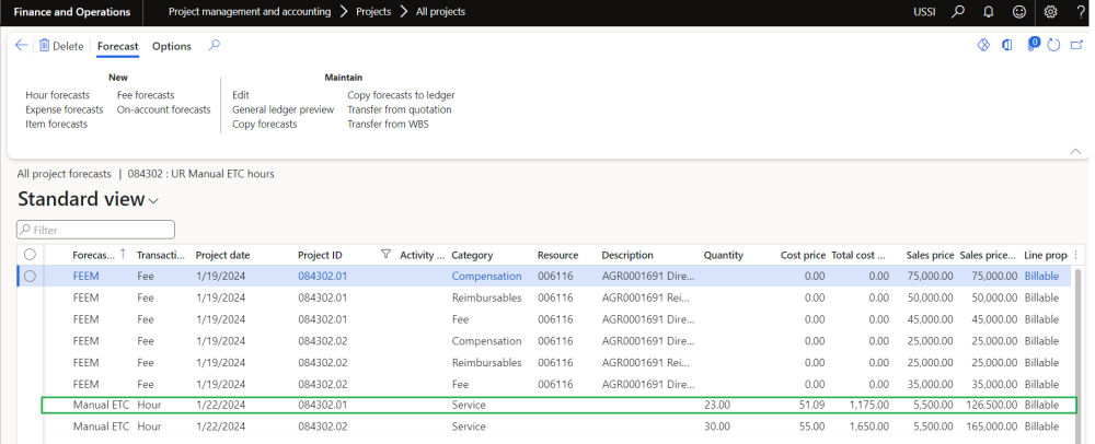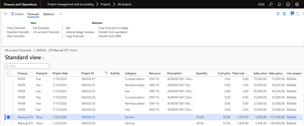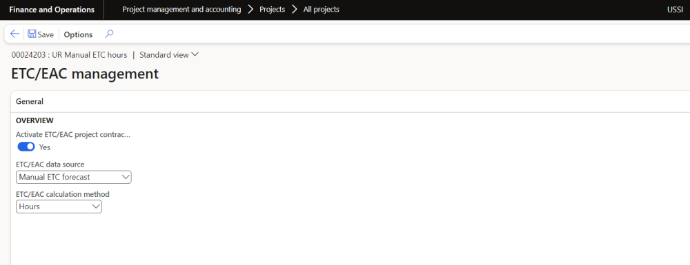 On Contract management – ETC/EAC settings id defined as Manual ETC forecast” with calculation method as “Hours”