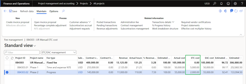 Go to Project management and accounting > Projects > All projects > Fee management tab > ETC/EAC management