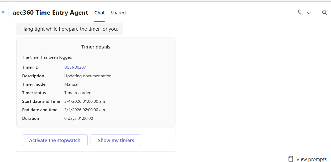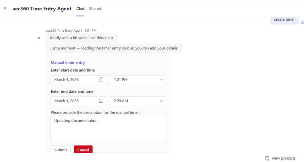 The Time Entry Agent makes tracking your work simple with its built-in timer feature. Instead of manually entering hours, just select the date, set the start time, and submit the timer. The agent will automatically record your time accurately for the selected entry.