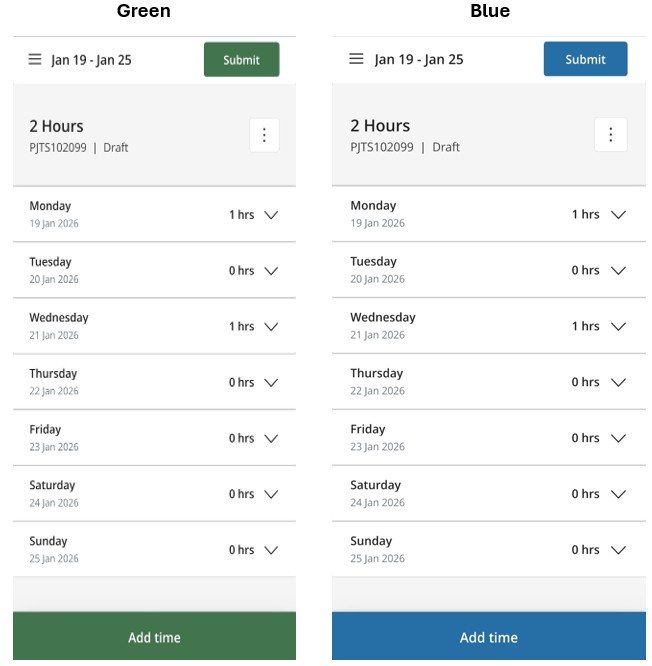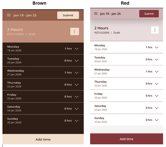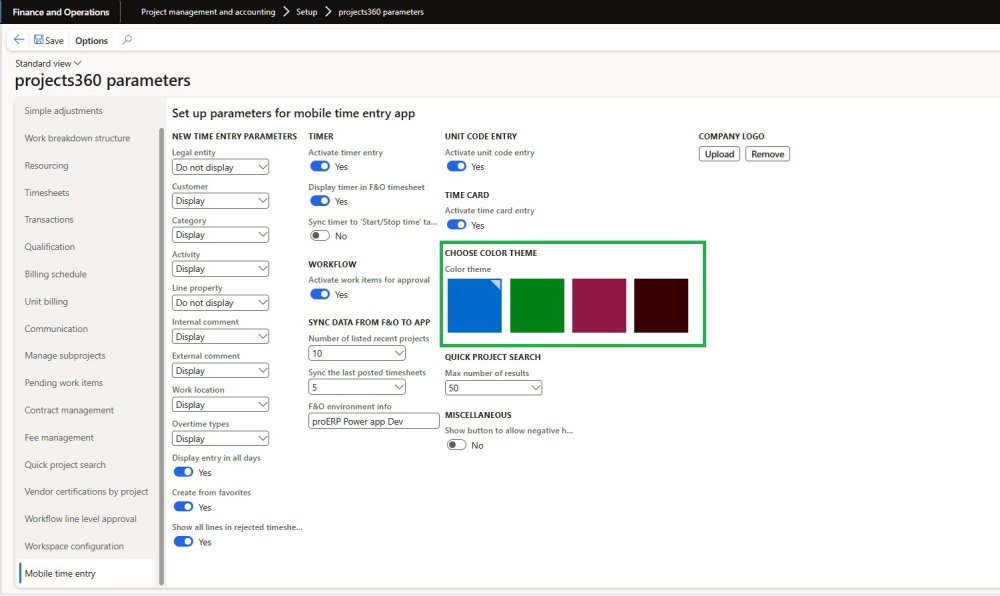 In the projects360 parameters form, within the Mobile time entry tab, system administrator can choose the company’s color scheme. Once selected, the timesheet app will be displayed in the chosen color scheme. If the app is open when this configuration change is made, the user will need to refresh the app or close and reopen it for the color scheme to take effect.