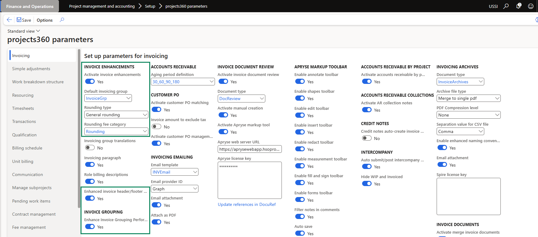 On projects360 parameters from, in the Invoicing tab, Invoice enhancements group has been introduced to control this feature.
