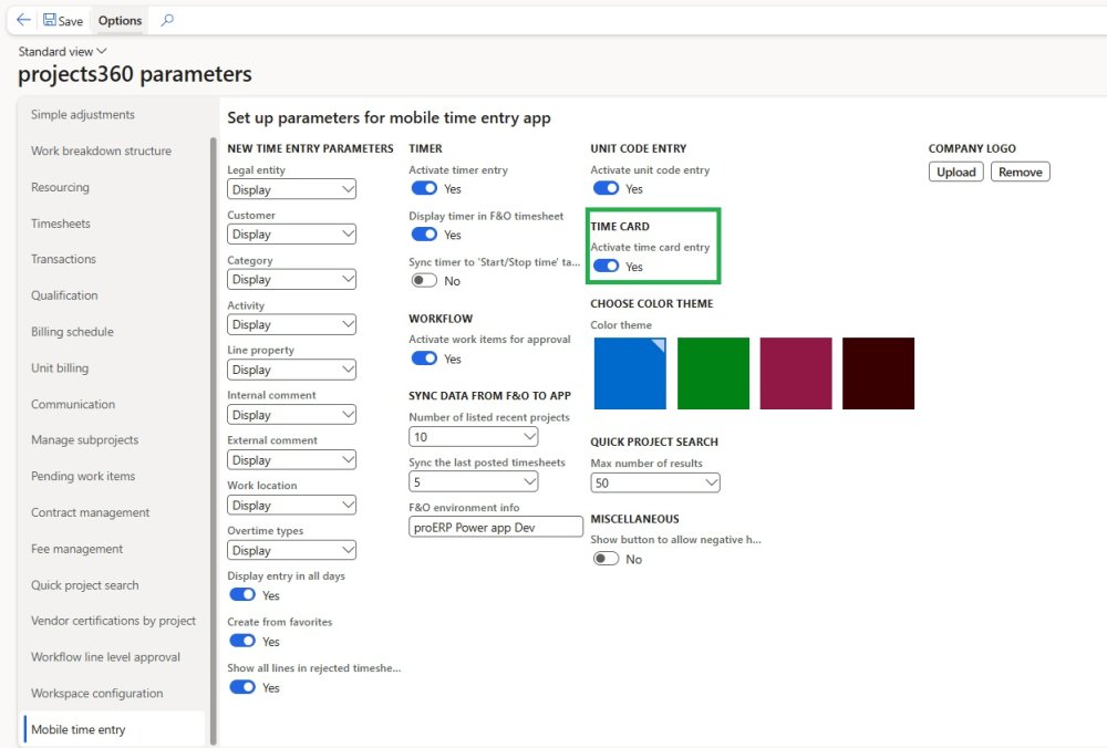 On projects360 parameter form, under Timesheets tab, a new parameter “‘Activate time card entry” has been introduced to enter time card on timesheets. User needs to set the ‘Activate time card entry’ field value to ‘Yes’ in order to use this feature.