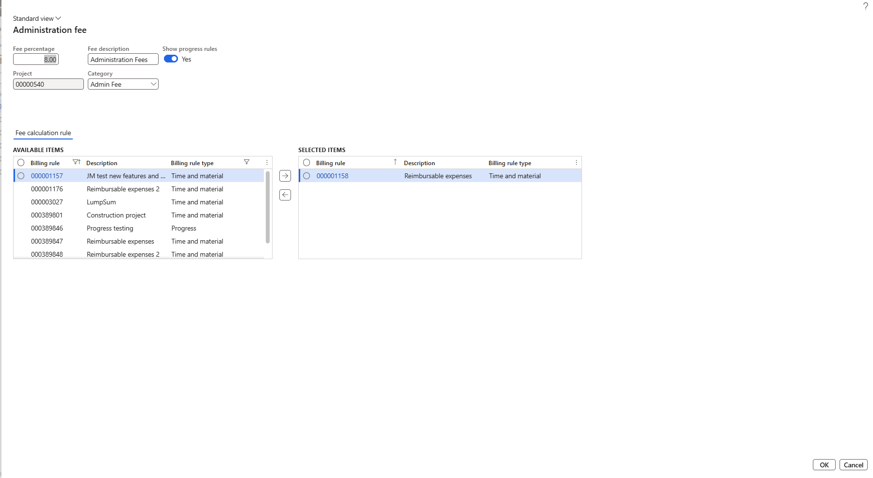 | Fee calculation rule section | Displays all the billing rules which is of Time and material type. User can select the billing rule from available list to selected list to create administration fee billing rule for the selected time and material billing rule. |