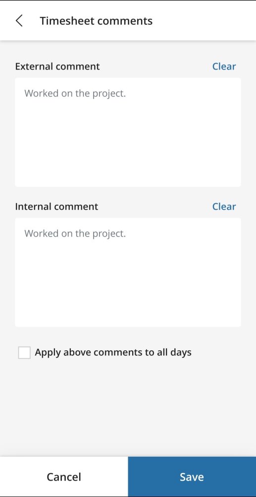 | Note – The mobile application will trigger a warning to the user if timesheet comments are not provided even when the parameter for timesheet comments are set to ‘Yes’ in the Projects360 timesheets settings. |