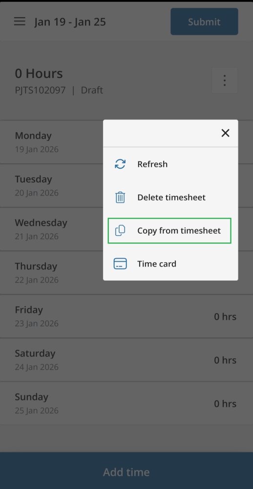 Users can initiate the ‘Copy from Timesheet’ function by clicking on the ellipse dots located in the top right-hand corner. Following this, users can select the specific timesheet they wish to replicate.