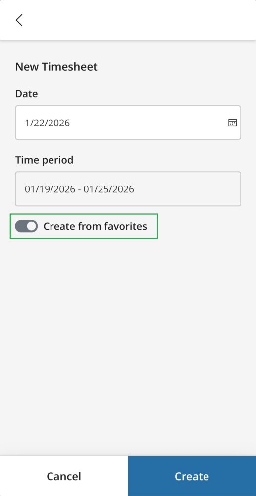 To support this capability, a new parameter, Create from favorites, has been added to the Projects360 Parameters form. This parameter is dependent on Display entry in all days. When Display entry in all days is enabled, the Create from favorites parameter becomes editable. Users can update the Create from favorites parameter directly within the Time Entry Power App while creating a new timesheet.