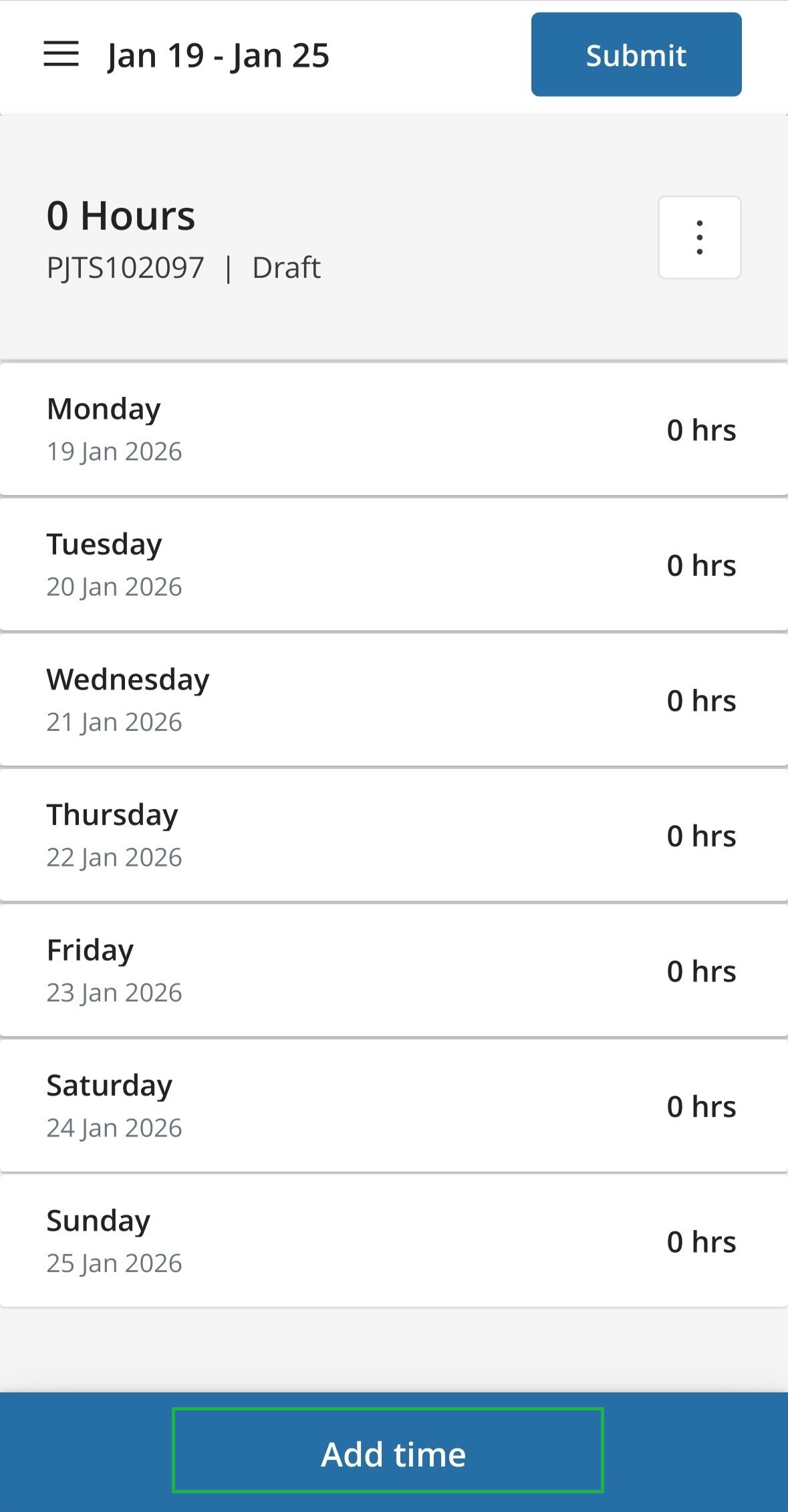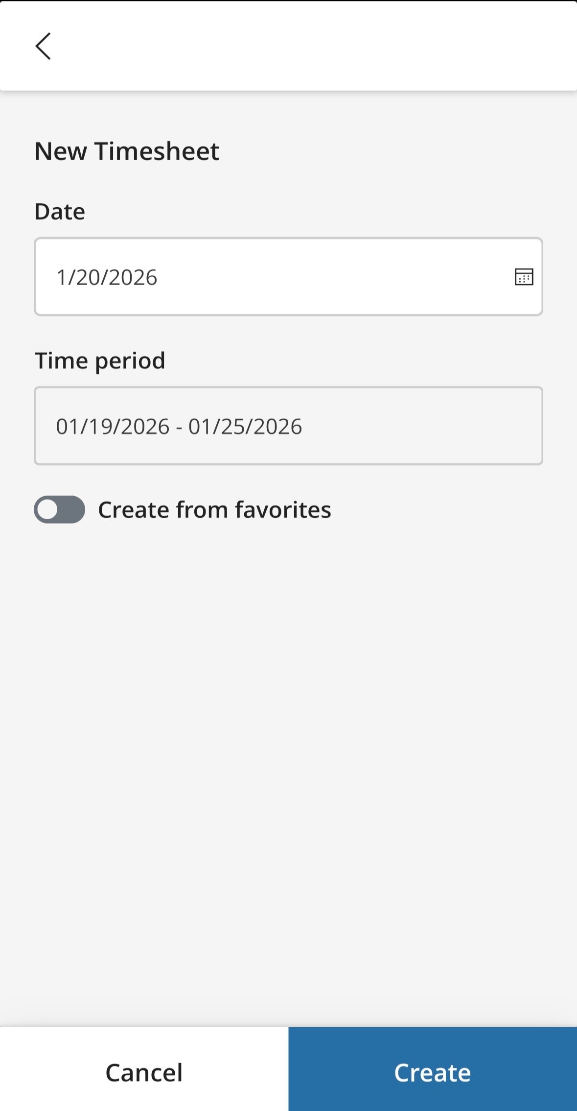 - Automatic period selection: Based on your date selection, the timesheet period will be automatically populated.