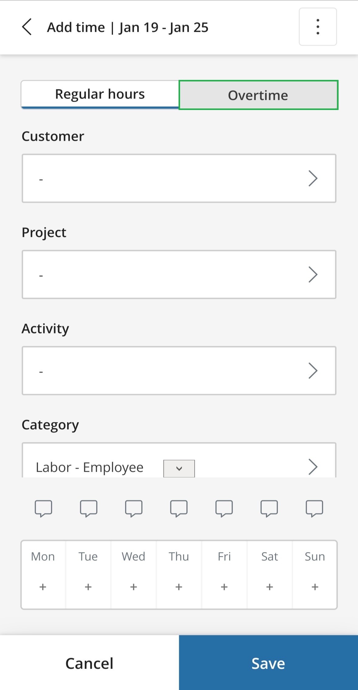 Upon clicking the Add time button, users can input both their regular hours and overtime hours by toggling between the respective tabs.