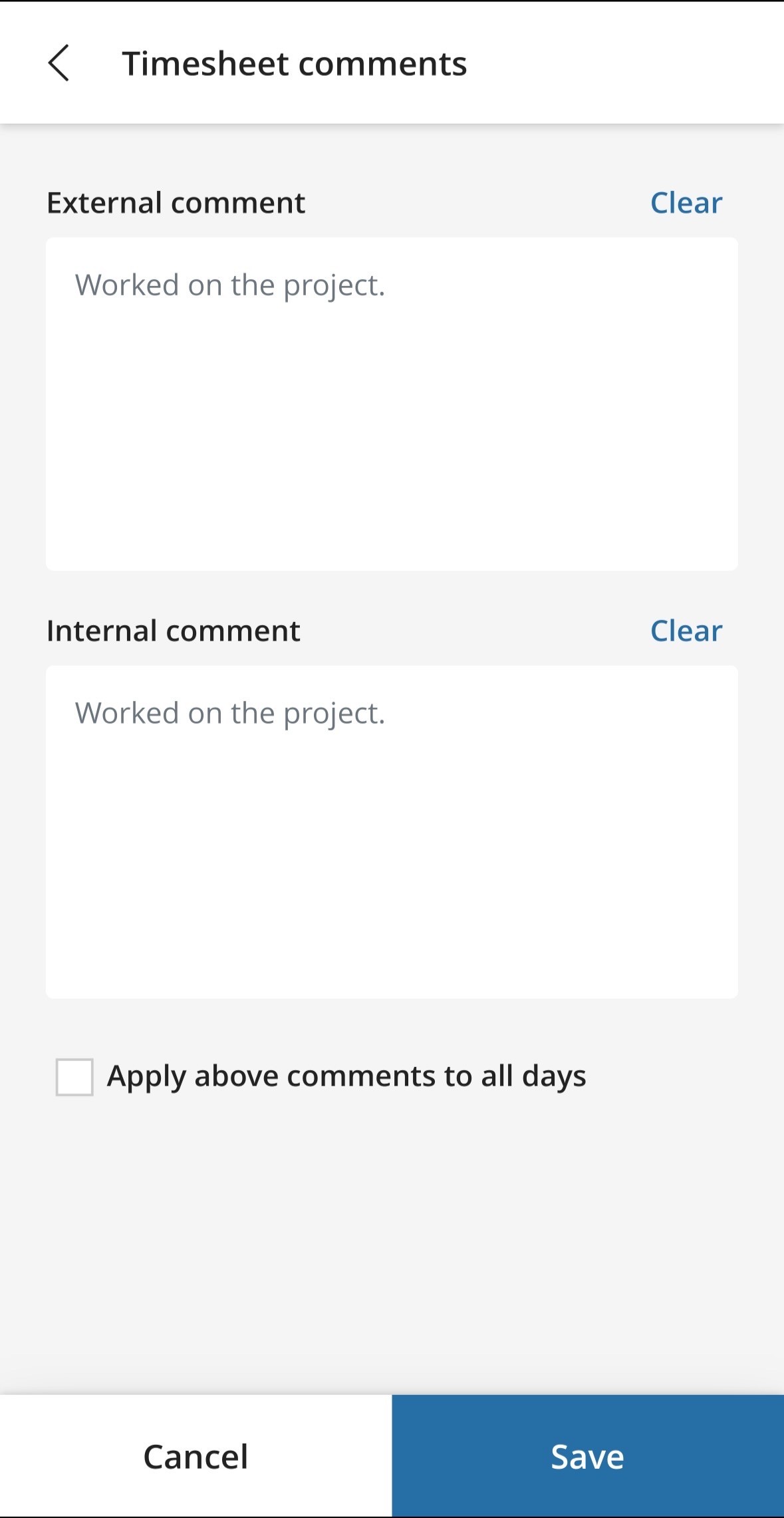 We have incorporated multiline text fields that allow users to input both external and internal comments for each hour entry. Additionally, users have the ability of copying a comments across all days within the same timesheet line for the entire timesheet period using ‘Appy above comments to all days’ option.