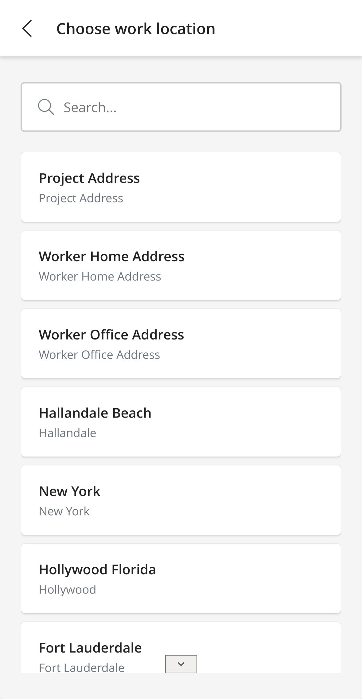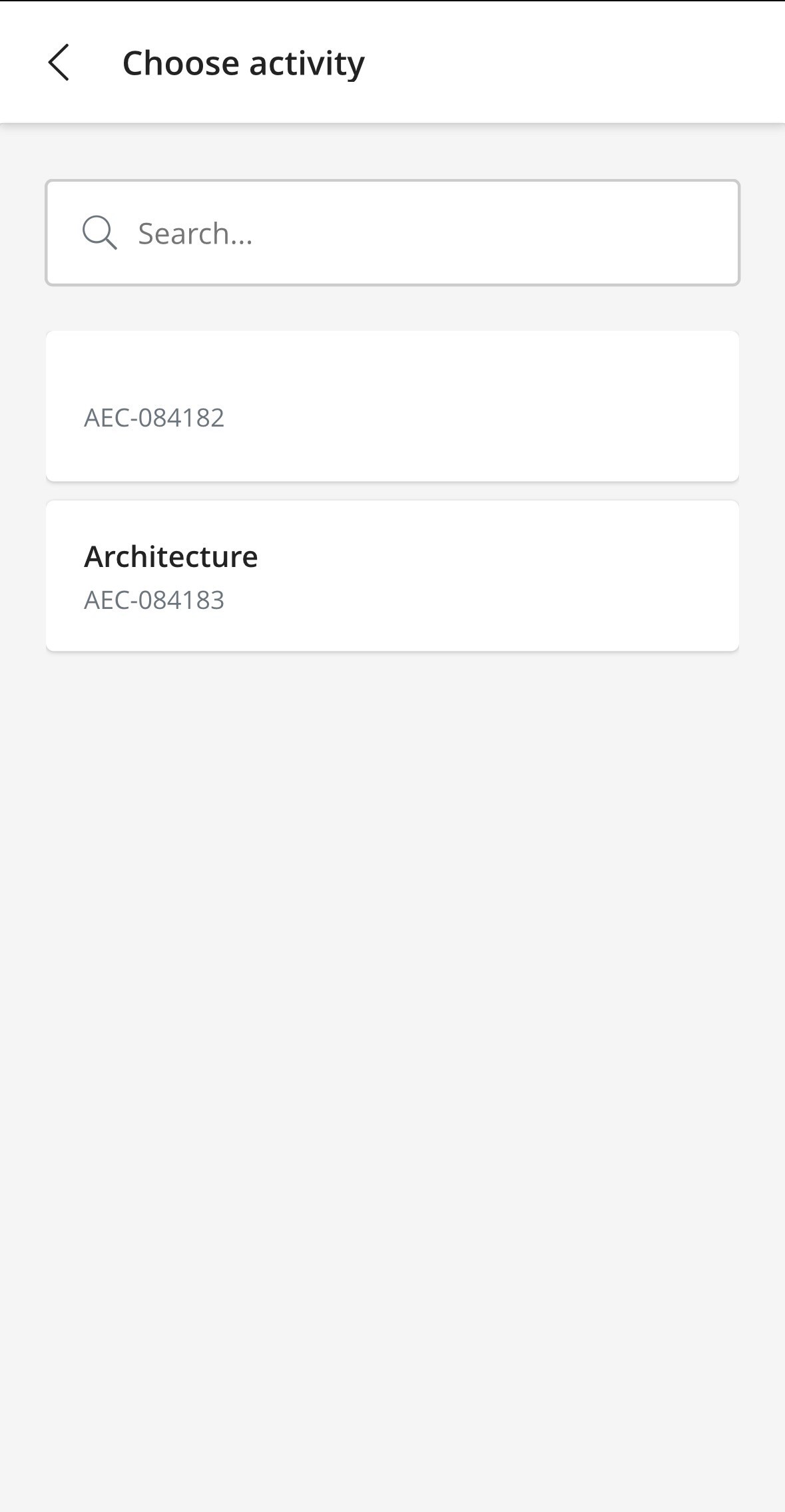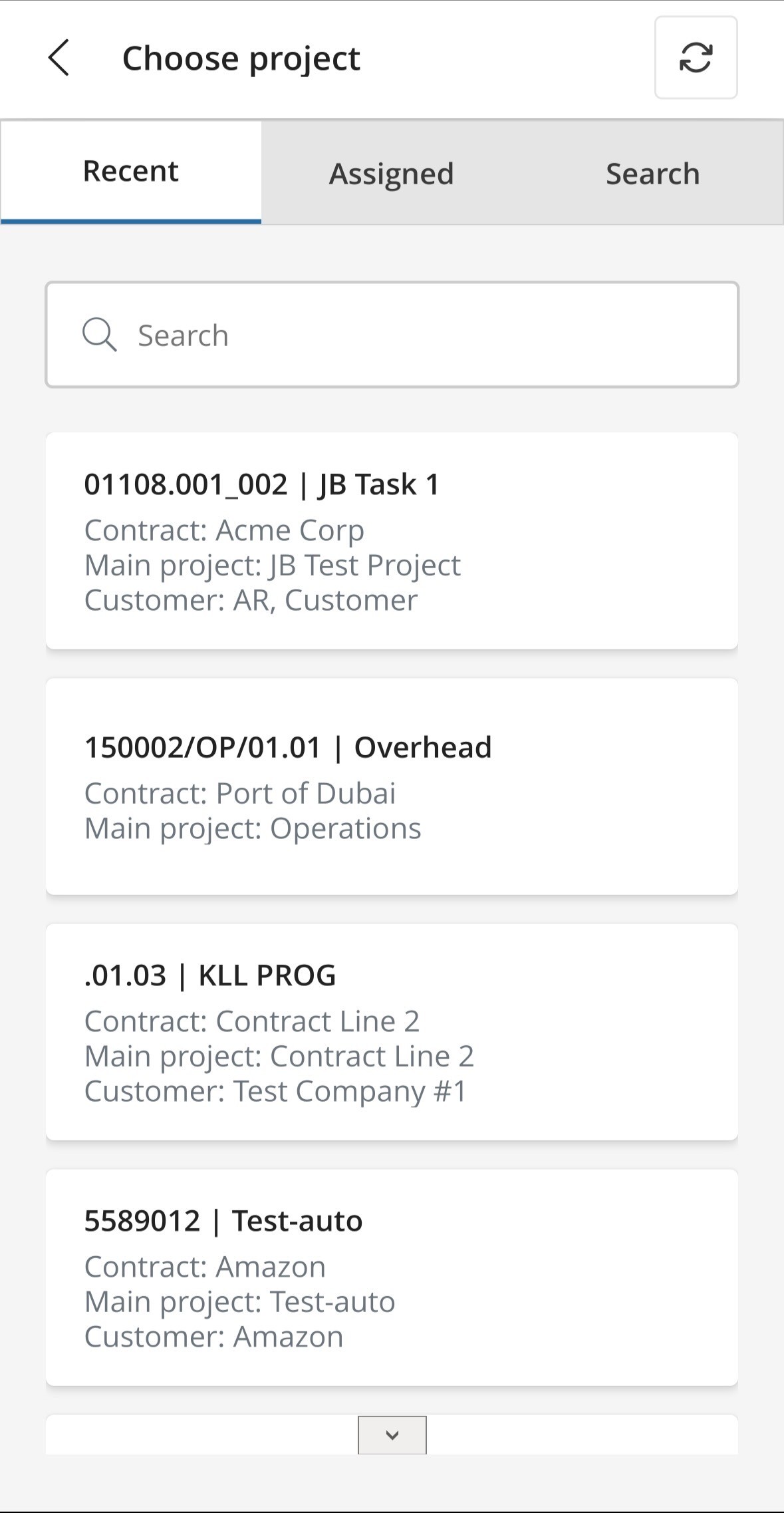To facilitate project selection on the timesheet, the app offers users the flexibility of choosing projects from recent, assigned, and search options. Key information is displayed such as project Id, project name, contract description, main project name and customer name.
