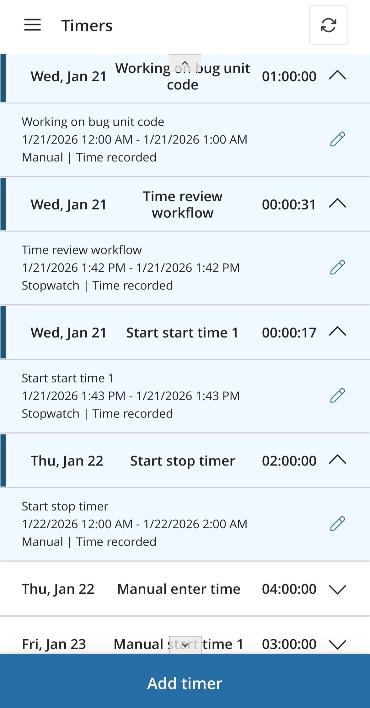 When the “Timers” button is clicked, new page will be opened displaying all the open timer entries.