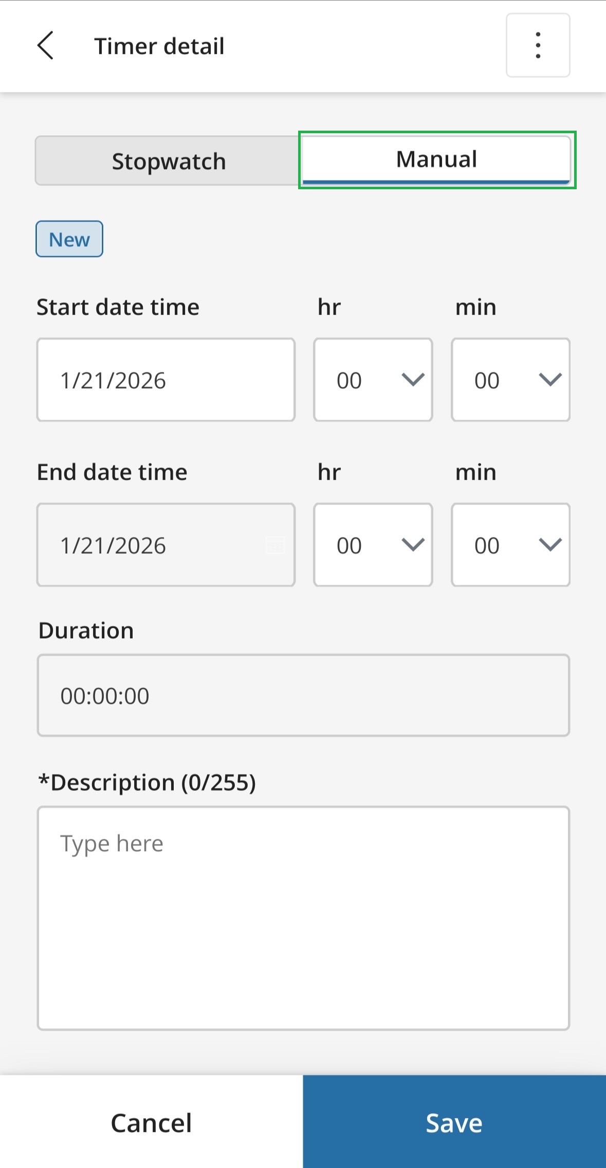 After clicking the ‘Add timer’ button on the Timer entries page, a new timer details form will open. This form provides two different tabs, giving users the option to use a stopwatch or a manual process.