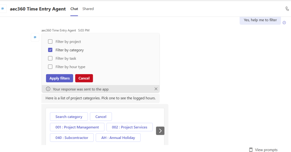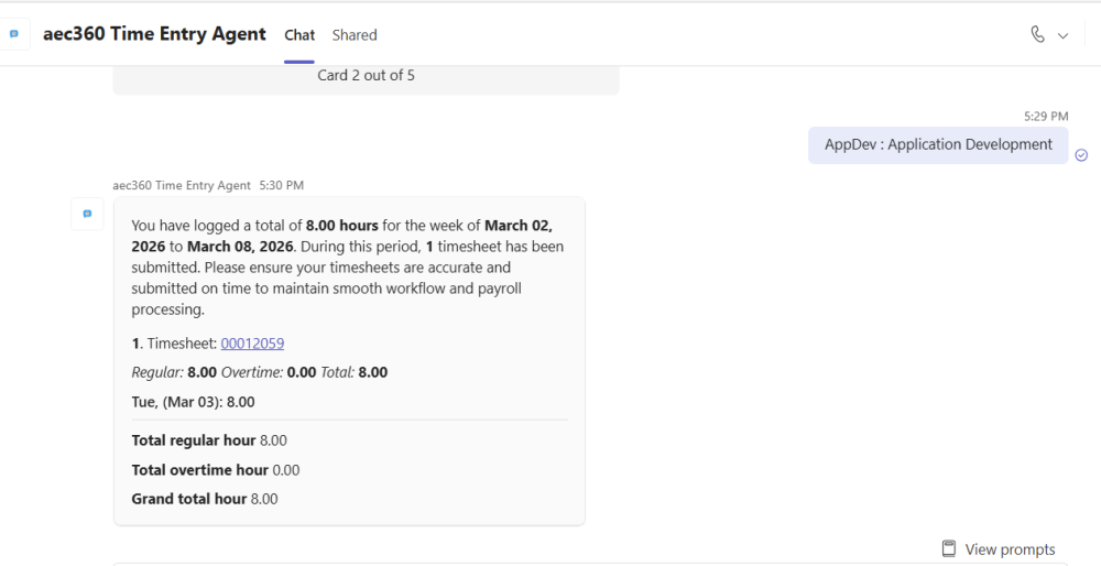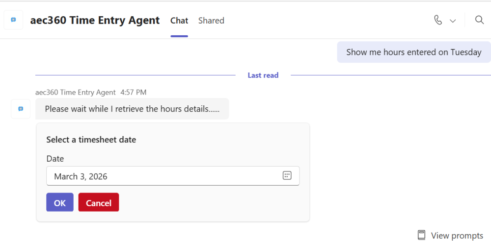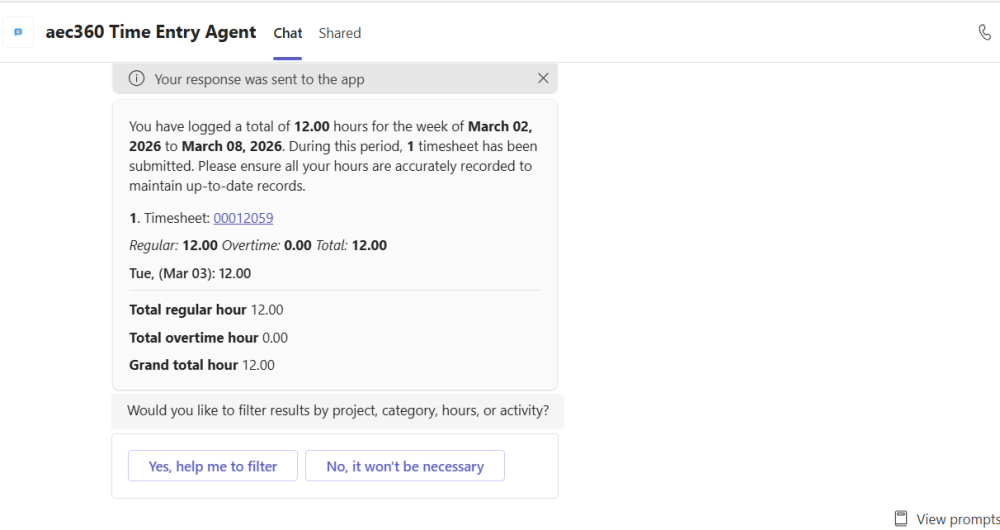 Users can ask the Time Entry Agent to show the hours entered for a specific day or for the entire week, making it easy to keep track of time without navigating away from the conversation.