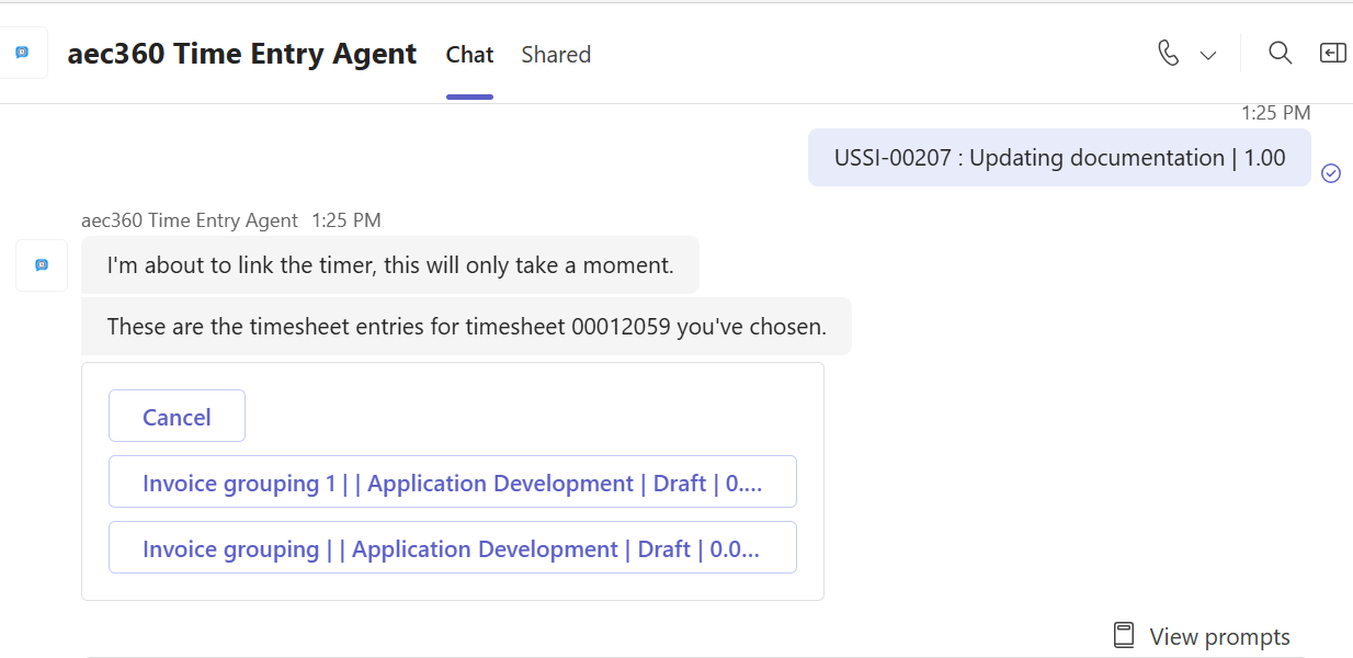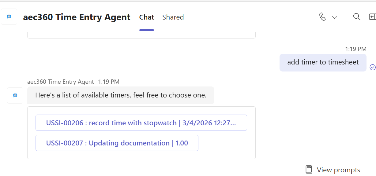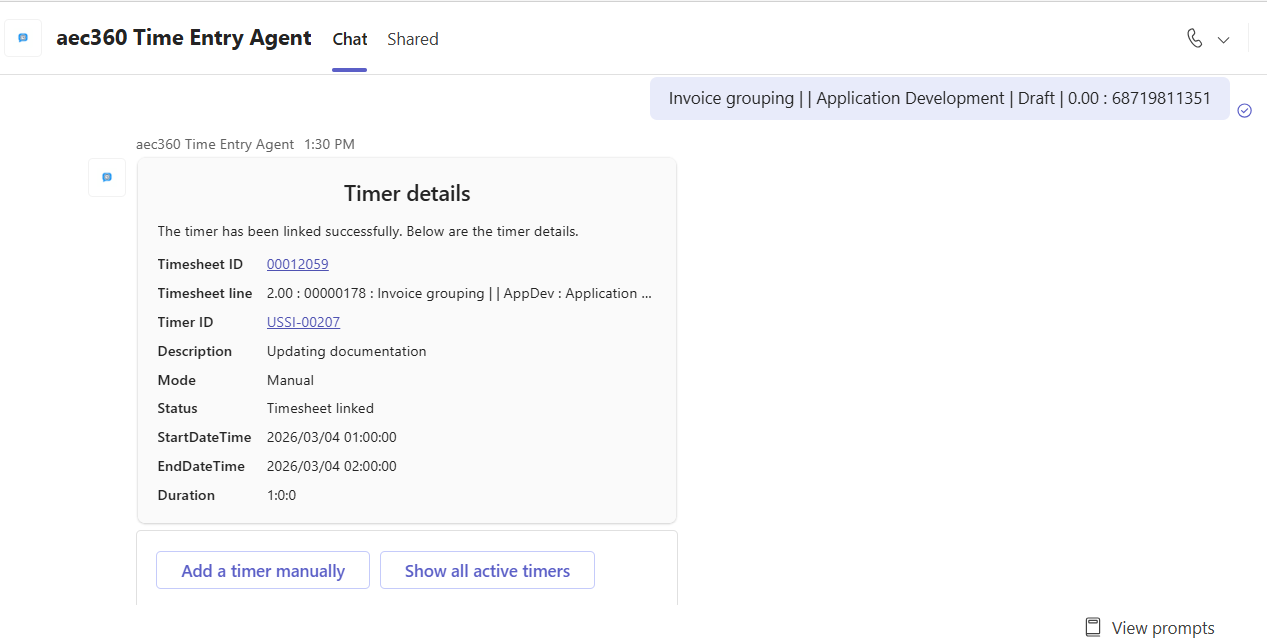 With the Time Entry Agent, you can link the timers you create directly to your timesheet. Once a timer is associated with a specific project or task, the tracked time is automatically captured and recorded in the correct timesheet entry.