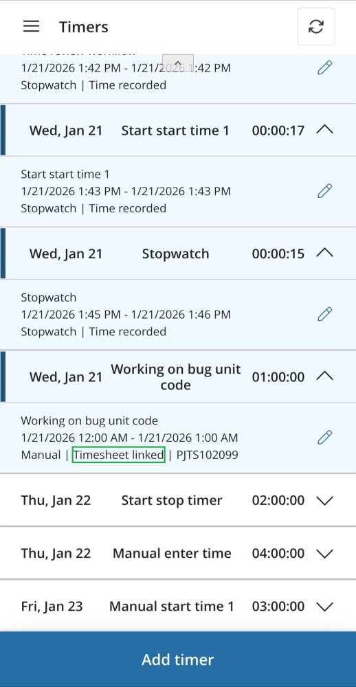 - The timer will be updated to status “Timesheet linked”. This status informs the user not to modify or reset timers.